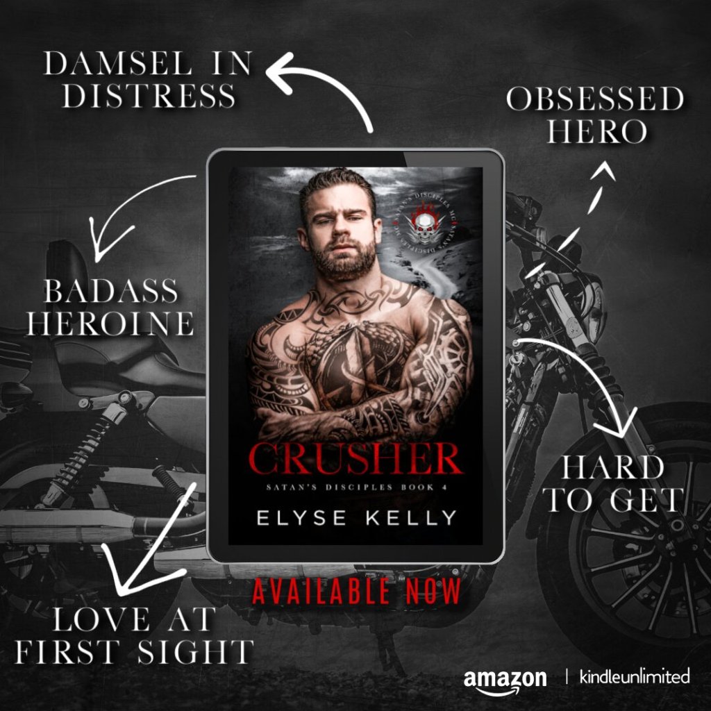 CRUSHER is book 4 in the SATAN’S DISCIPLES MC SERIES. This is a love-at-first-sight, obsessed hero, MC romance packed with action and spice, and a badass heroine! Prepare to fall in love with this sexy biker when he sets out on a mission to rescue the only woman he can’t live without.